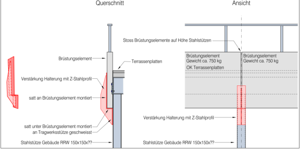 beiden Nebenterrassen können weiterhin genutzt werden. Die Hauptterrasse wird gesperrt, da im Bereich der Hauptterrasse ostseitig kein neues Geländer montiert wird. Die Sicherung der restlichen Brüstungselemente soll mit einem Z-Stahlprofil erfolgen. Die Brüstungselemente sind jeweils auf Höhe einer Stahlstütze des Haupttragwerks gestossen. Das Z-Stahlprofil soll an der Stütze befestigt (geschraubt oder geschweisst) werden damit die Brüstungselemente vertikal, wie auch horizontal gesichert werden können. Das Profil wird satt unter den Brüstungselementen montiert, damit die Elemente aufliegen. Durch das obere Blech des Z-Profils werden die Brüstungselemente auch horizontal gehalten. Sollte es zu einem Versagen der bestehenden Halterung kommen, werden die Brüstungselemente durch die neu angebrachten Stahlprofile an Ort und Stelle gehalten.